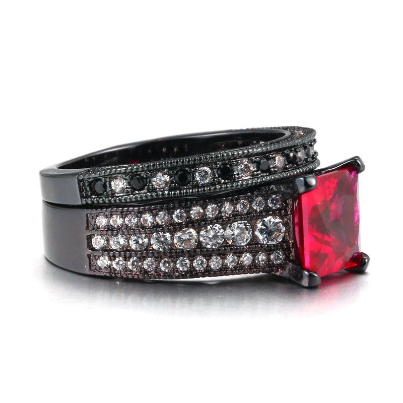 Princesse Cut Rose Red Sapphire 925 Sterling Silver Black Engagement / Wedding Ring Ensemble De Mariée